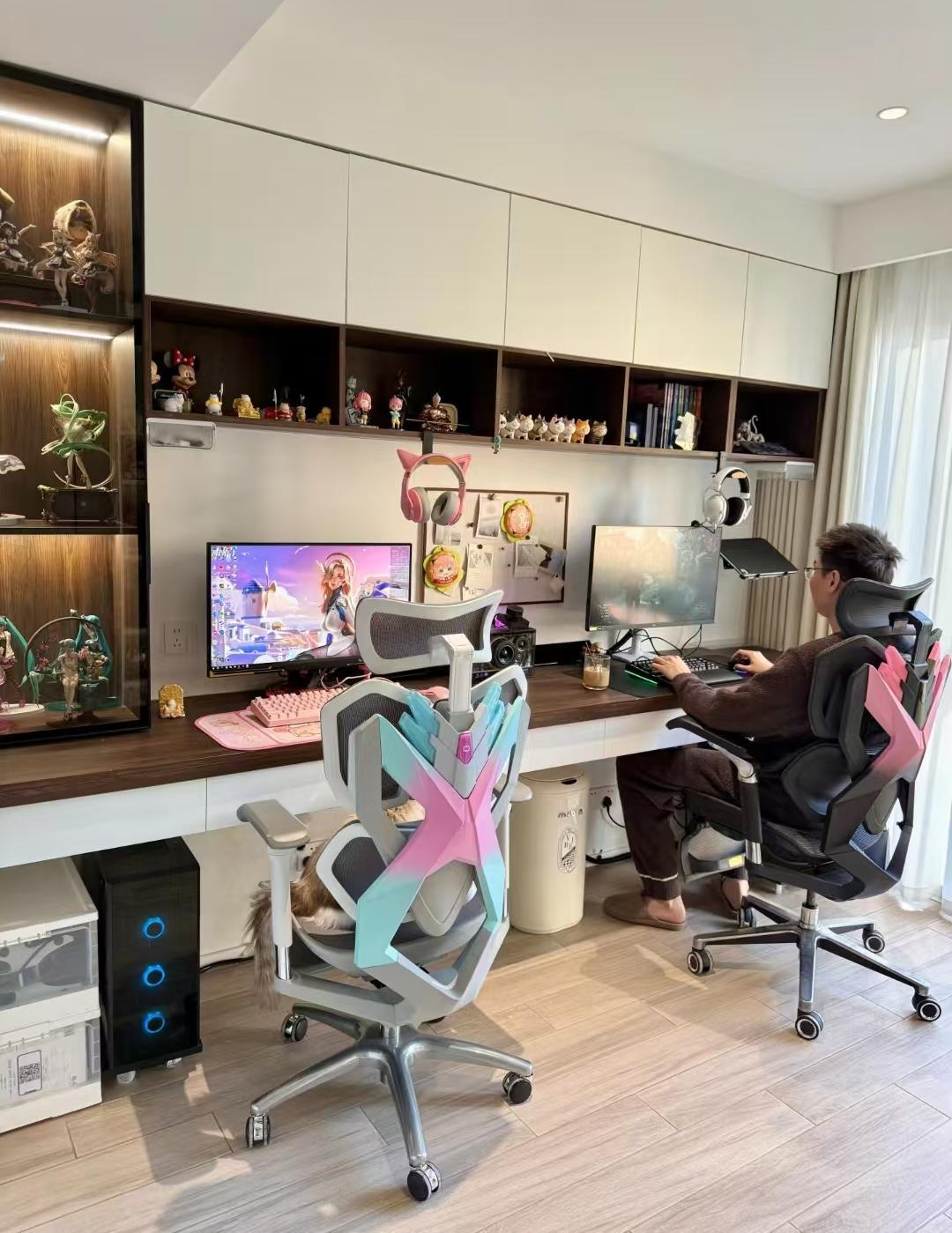 北面的小房间设计成了电竞房,定制了超长的书桌和书柜,摆上电脑,夫妻俩没事的时候就在这里开上一局,一分高低。