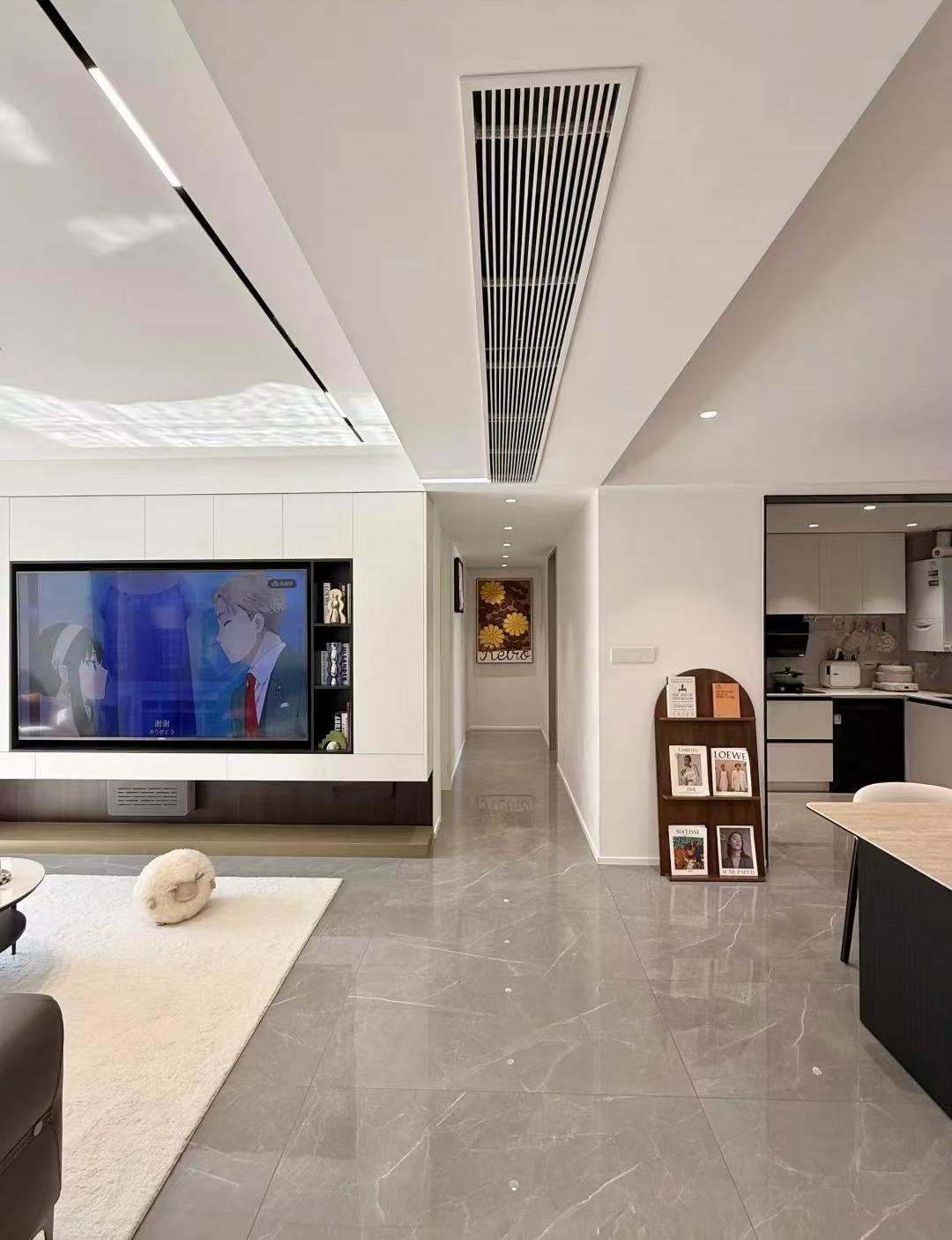 客厅的电视墙定制了满墙收纳柜,底下用大理石做了落地式地台,柜子地漏镂空,上面是黑白搭的柜门和柜体,电视位置也是留的刚刚好,整个设计看上去又轻盈又简约。