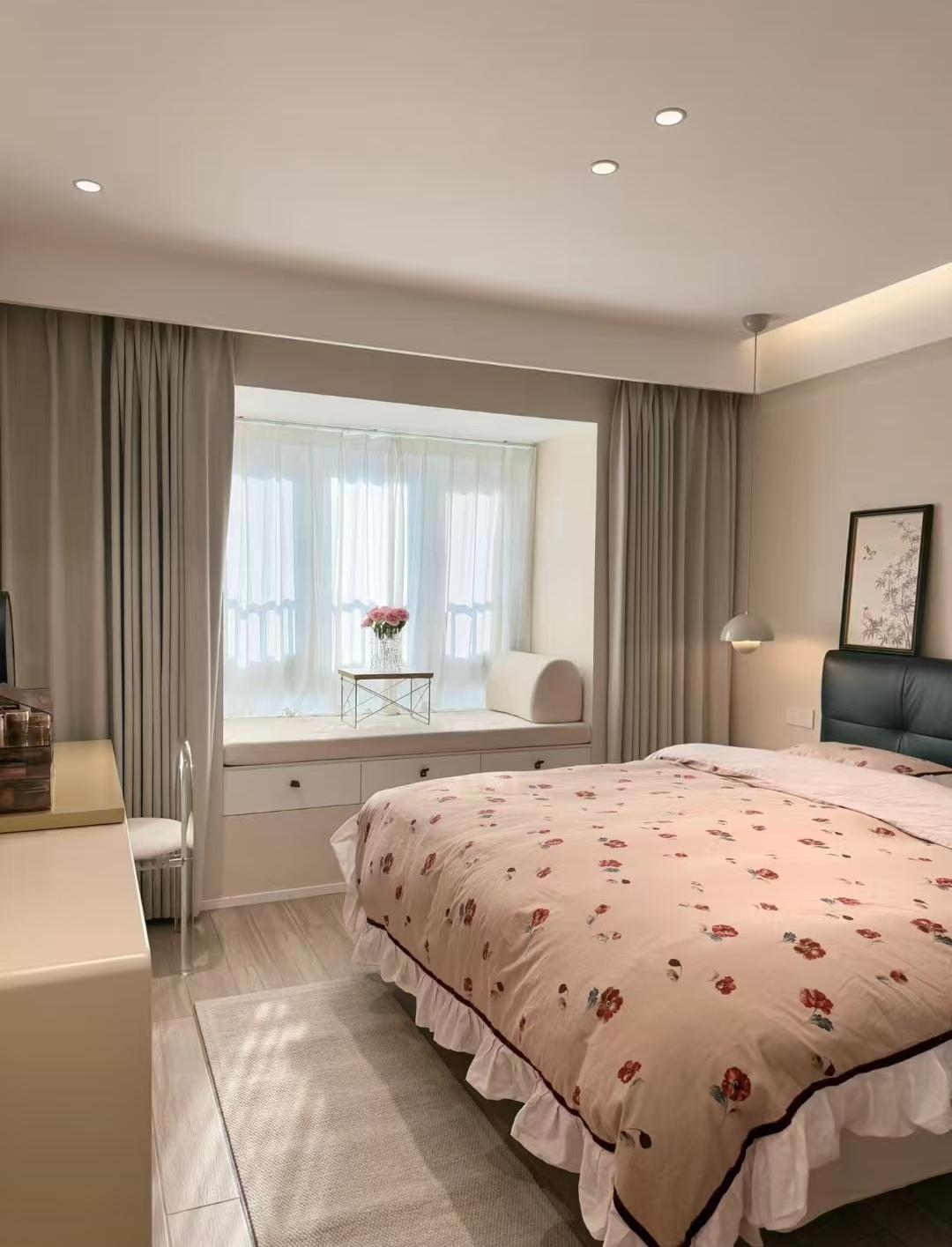 主卧面积也不是特别大,但是布置的很温馨,墙面全部通刷了奶咖色乳胶漆,浅灰色的绒布窗帘,黑色的软皮质床头靠背,既温馨舒适又不失时尚。