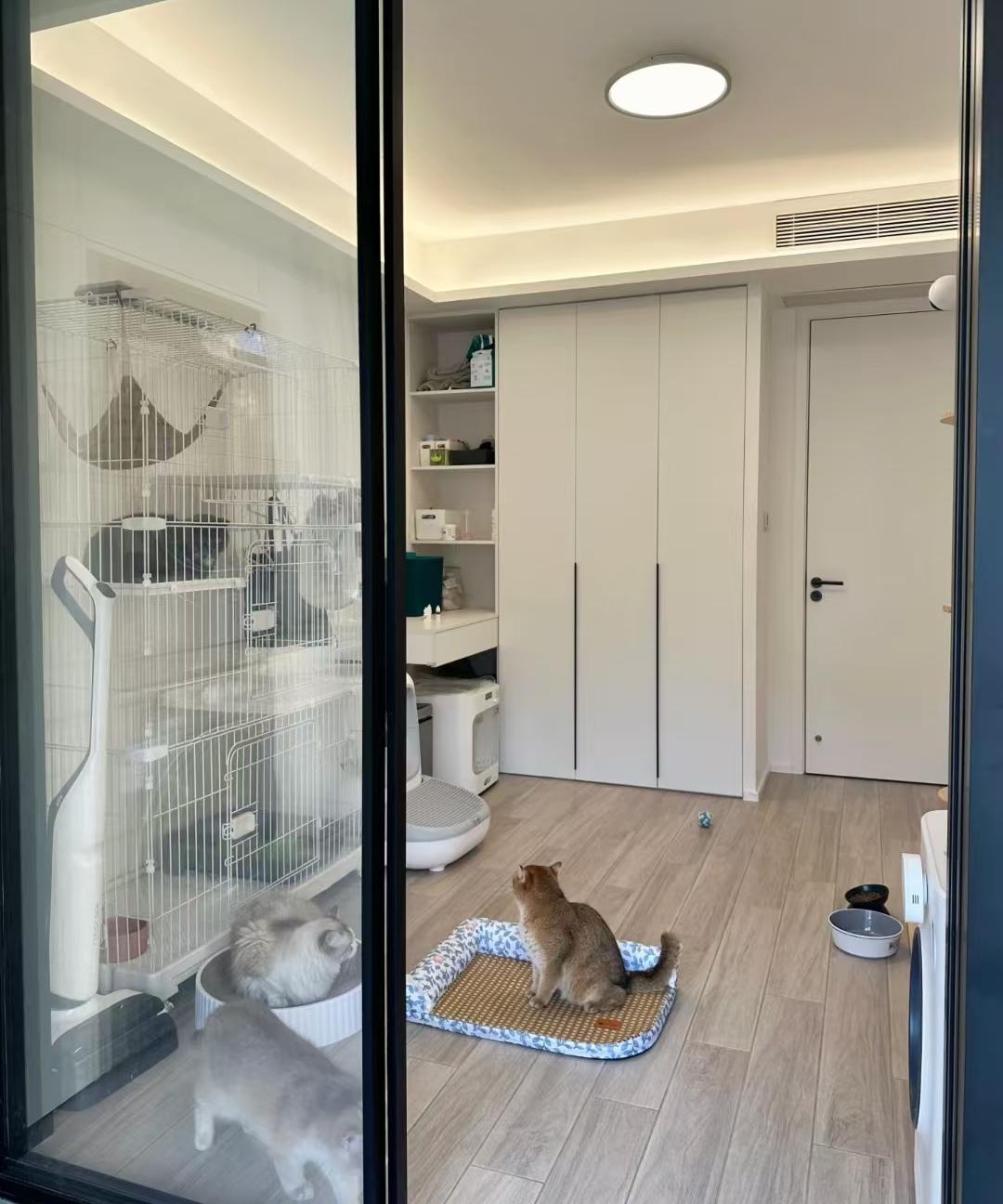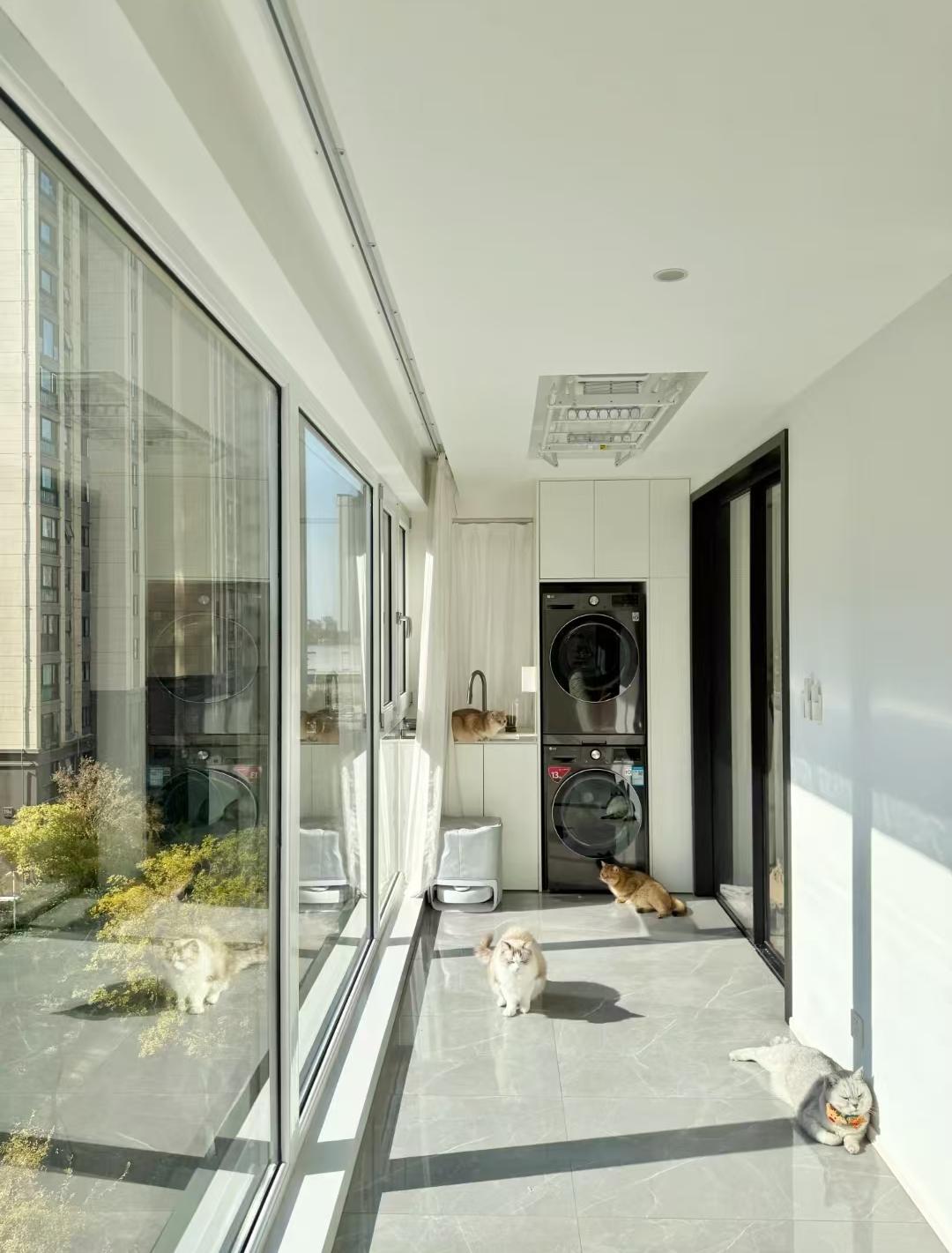 朝南的双阳台,一侧连通客厅与客厅打通,另外一侧在次卧外,与次卧之间用移门隔断,阳台定制了洗衣机柜;此时,屋主的几只喵星人正在这里嬉戏。