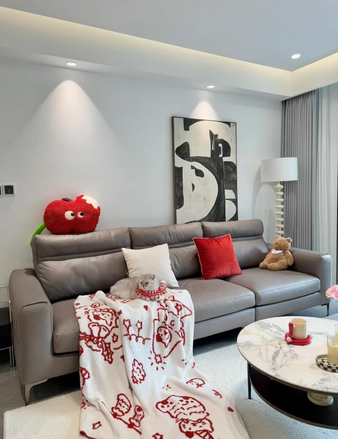 沙发墙同样没有做造型,简单的大白墙,一幅抽象的黑白画,高级灰的沙发,一盏落地灯,清爽又好看,两个红色的抱枕点亮了整个空间。