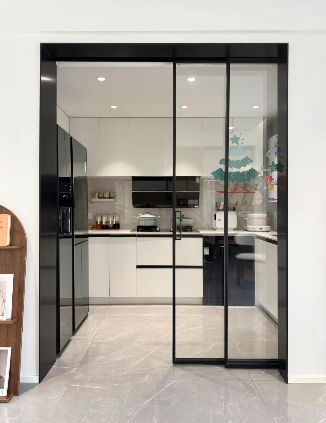 厨房与餐厅之间用玻璃移门隔断,屋主特意挑选了极窄边框的玻璃门,搭配白色的橱柜,满满的高级感。