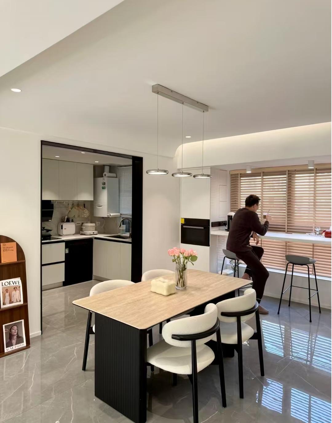 餐厅原来的小阳台拆除后纳入到了室内,一侧定制了高柜嵌入蒸烤箱,窗前定制了吧台,闲来无事的时候坐在这小酌一杯,甚是惬意。