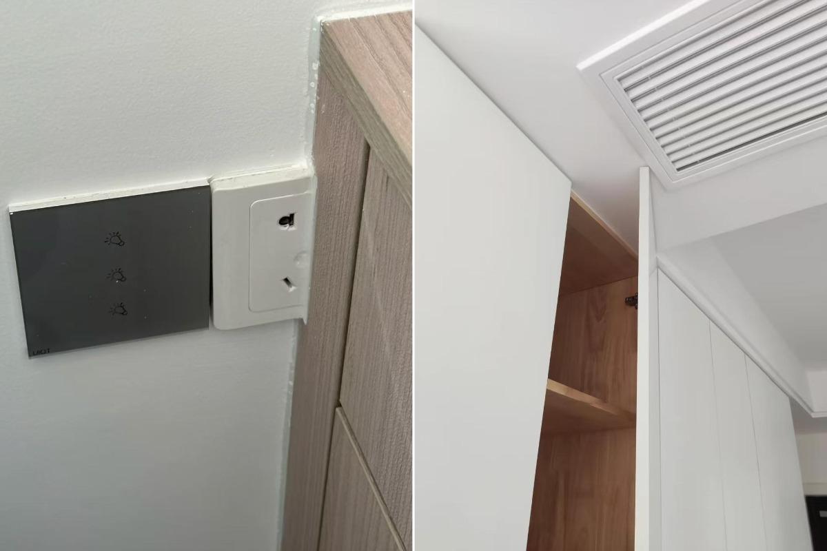 结果,装好后哪哪都是问题,插座被挡住不能用,干区浴室柜抽屉和门套“打架”,卧室衣柜柜门撞上中央空调,墙砖没有做海棠角等等,全都是问题。