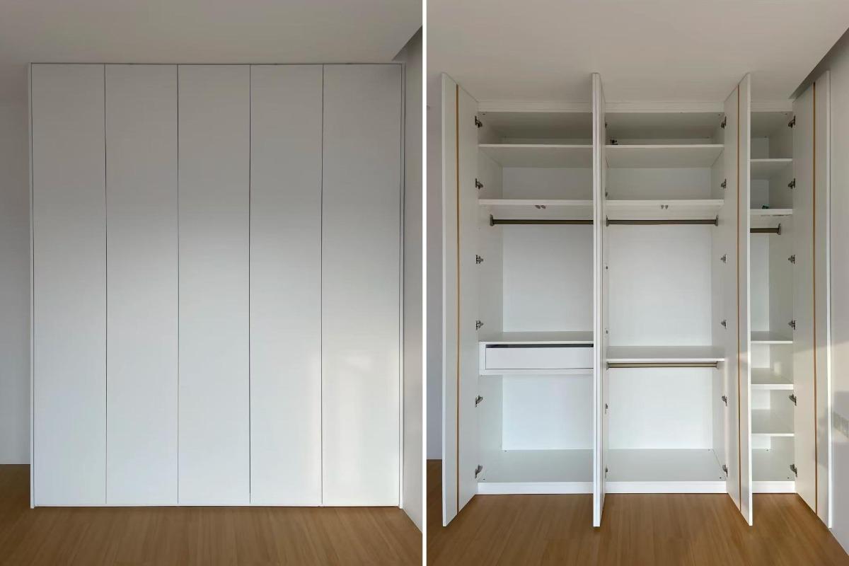 但是入住后发现,一门到顶的缺点太多了;比如打扫卫生的时候,柜门下的灰尘需要把柜门打开才能清理的到;再比如开关柜门时需要把脚后撤一大步才能不影响柜门。