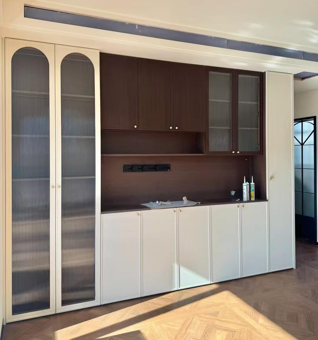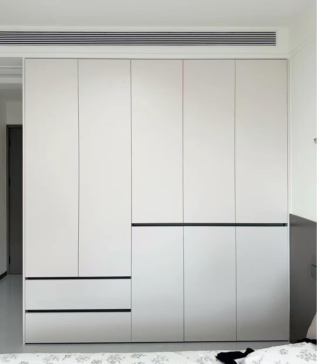 综合考虑了一下,我家还是选择了分段式柜门设计,内嵌式拉手,安装好后的效果还是不错的。