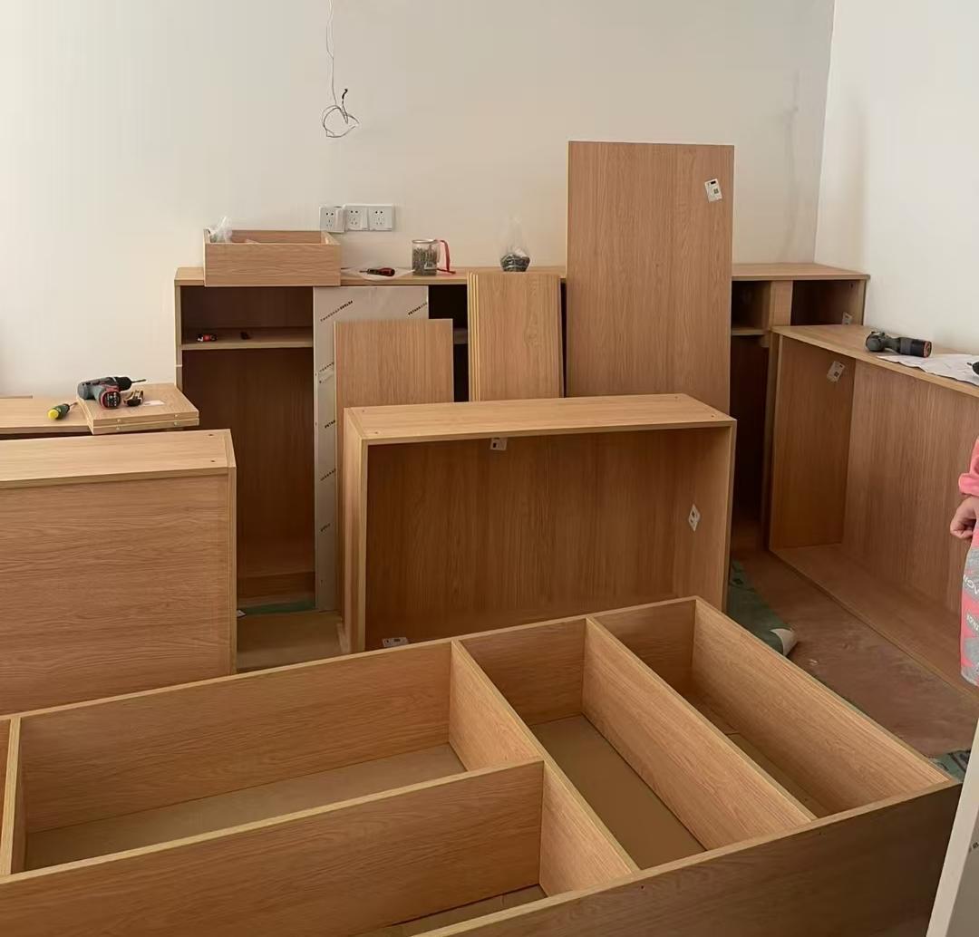 我家全屋柜子算下来有差不多30㎡,全屋定制按照我的设计图报价从3万到5万不等,对我来说有点贵了,我就在材料市场找卖柜子板材的商家,然后问他们是否提供板材加工。