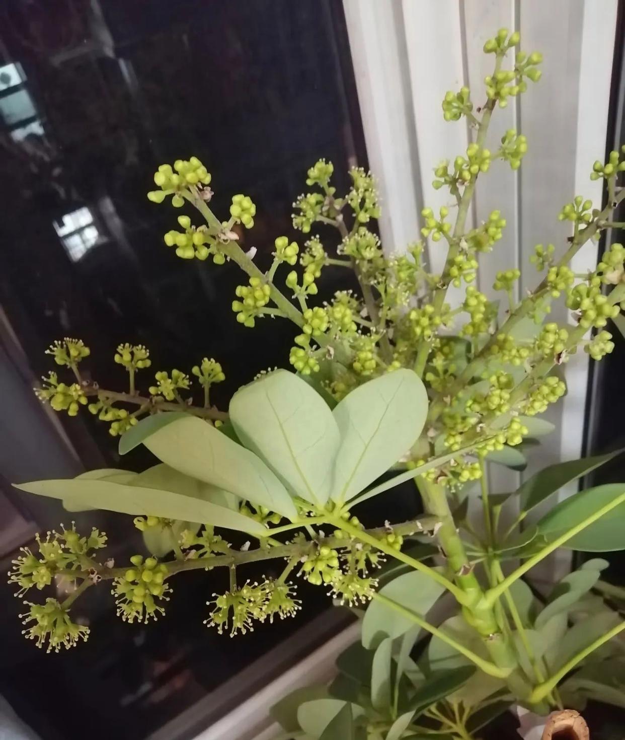 鸭脚木是一种观叶植物,它的叶片由7到8个小叶组成。有些人养了十多年也没有开过花,其实鸭脚木也是可以开花的,且开花寓意喜事临门。