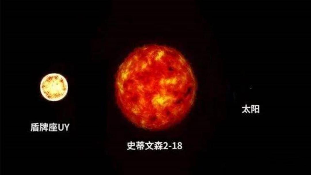 首先,来看看名气很大的盾牌座UY。它和斯蒂芬森2-18同样都位于盾牌座,它的半径大概是太阳的1708倍,体积则是太阳的50亿倍。可见,虽然它也很大,不过和巨无霸斯蒂芬森2-18比起来还是小巫见大巫了,如果将它替换我们的太阳,那么它的边缘至少可以吞没木星的轨道。