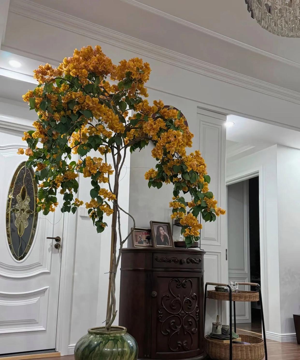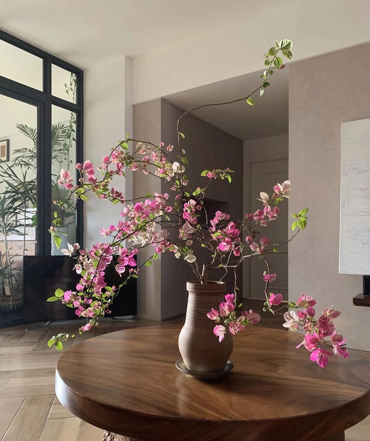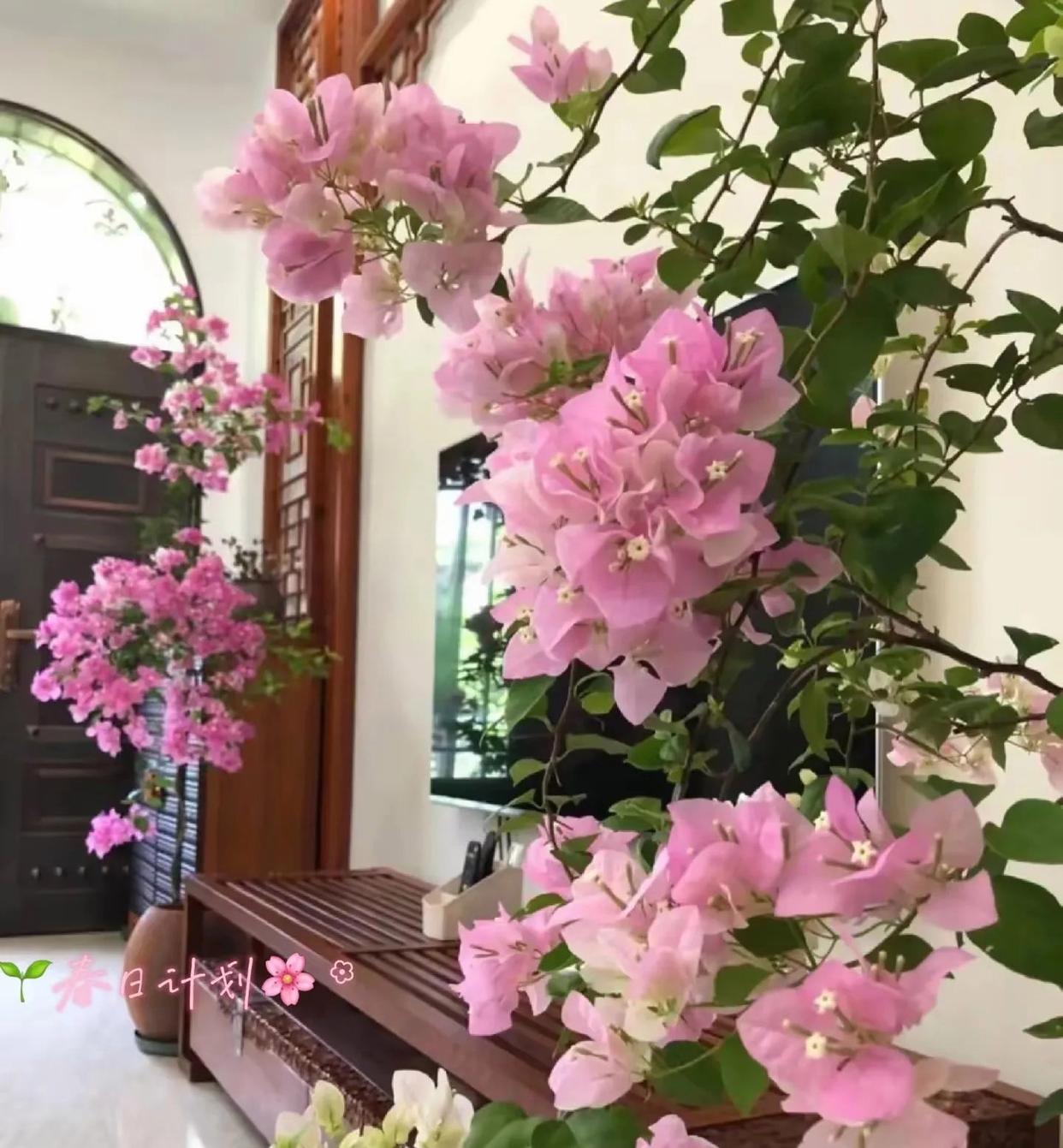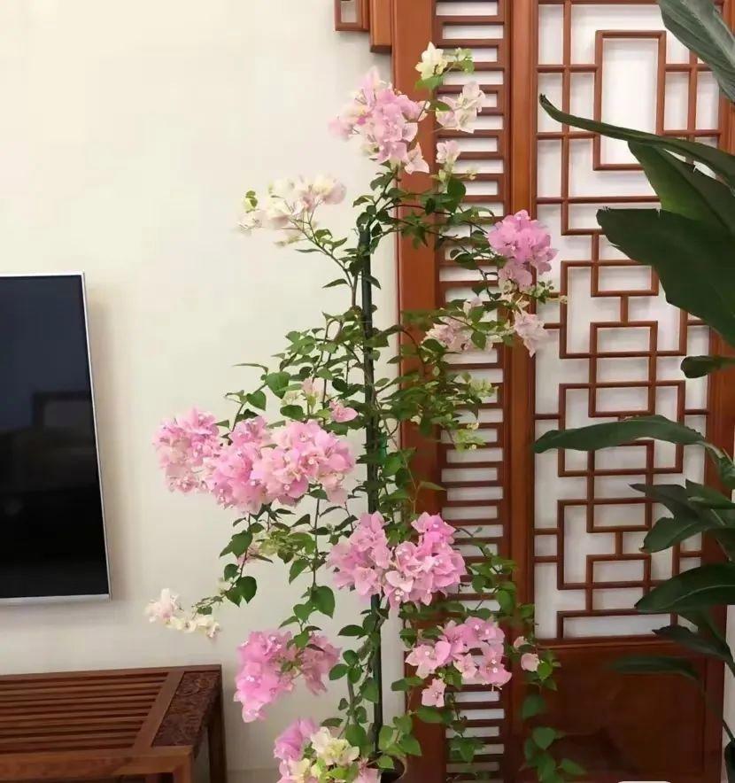 再有@邯郸讲述,不仅把三角梅养在客厅,而且养在古香古色的电视柜两侧,搭配上古香古色的电视柜子,再加上粉色三角梅的朵朵漂亮花,也让客厅看上去更加的高级。