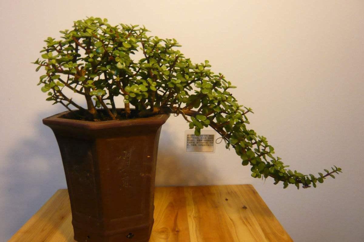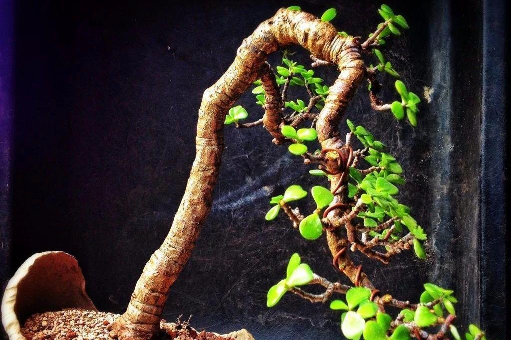 由于金枝玉叶是肉质根茎,就算木质化也是很脆嫩的,缠绕金属丝时,要很小心。使用带皮线的铝丝进行蟠扎,由下往上,由粗往细进行缠绕,像根茎部位比较粗壮。要选用较粗的铝丝,多缠绕几根才能控制住造型,而一些造型上不到位的地方,还需要采用吊拉等方式来控制造型。一盆成功的金枝玉叶造型需要经过时间的精雕细琢和耐心地等待才能完成。