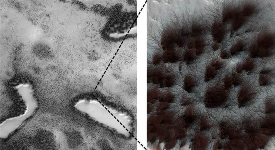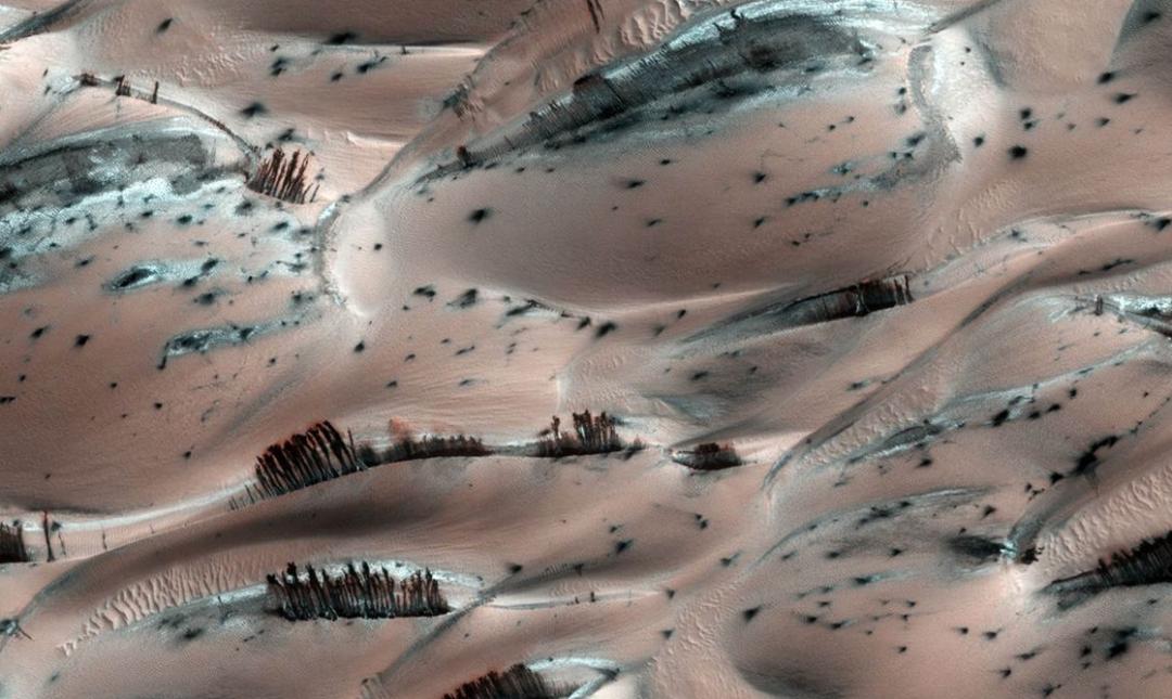 事实上,这些看起来特别像火星树木的东西,其实不过是二氧化碳的固体形态,也就是干冰。在火星漫长的冬季过后,当太阳将火星表面的一些二氧化碳冻层融化之后,这些冻层内部的沙子也会受到影响。也正因如此,我们才能够看到,在火星的荒漠之中,会有诸多黑色纹路不断向前拓展。