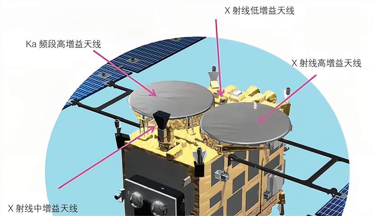 值得一提的是,由于隼鸟号在之前探测过程中遇见的问题,日本生怕隼鸟2号在造访龙宫的途中也失联了,所以专门给它装了三套通信设备,分别工作在X频段和Ka频段,还在这之上装了许多高增益天线,以确保时刻与其保持联系,并且接收各个设备传回的数据和照片。