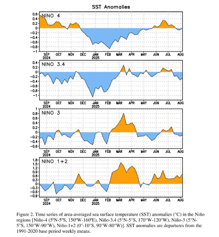 但是在8月发布新一轮数据的情况来看,出现拉尼娜的概率再次提升了,根据监控数据来看,其除了最东边的Niño-1+2指数(+0.8°C)之外,最新的每周Niño SST指数值在-0.3°C到+0.0°C之间,同时在过去的1个月之中,其出现了指数偏低的情况,为负数,这意味着又出现了拉尼娜的迹象。