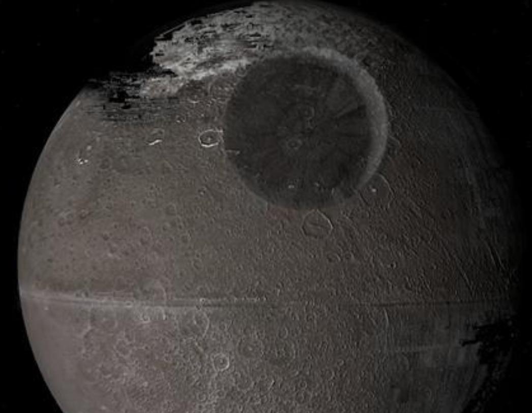 如果是从远处看去,土卫八就像是一颗核桃壳,但同时也有很多人认为土卫八可能是一颗人造的球状飞船,因为中间的赤道脊看起来就像是“焊痕”,是外星人拼接两个巨大球面的时候留下的痕迹。