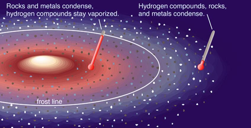 现在,让我们把视线从向外移动。随着距离太阳越来越远,温度也会逐渐下降,当远到一定距离时,那些被太阳烘烤成气体的挥发性物质,就会重新凝结成固体的冰晶。这种“刚好能让挥发性物质凝结成固体”的温度边限,就被称为“冻结线”(frost line)。