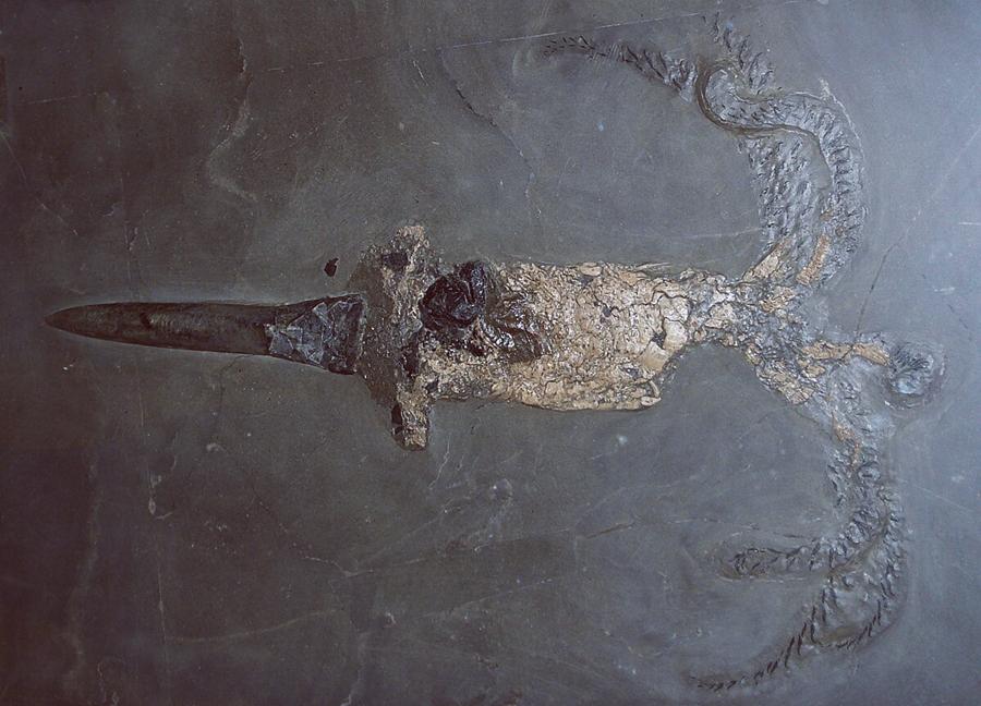 古生物学家认为,由于箭石的骨骼是内骨骼,因此这样的附着,只有在箭石死后,其软组织被微生物分解殆尽的时候才会发生,也就是说,将Tharsis鱼穿透的,其实是死去多时的箭石所留下的骨骼。