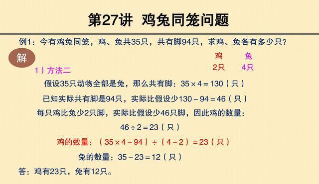 先来看一个例题:今有鸡兔同笼,鸡、兔共35只,共有脚94只,求鸡、兔各有多少只?