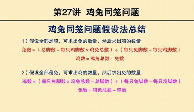 什么是鸡兔同笼问题?在大约一千五百年前的《孙子算经》中记录了这样一个问题:“今有雉兔同笼,上有三十五头,下有九十四足。问雉兔各几何。”这个题目就是现在大家耳熟能详的鸡兔同笼问题的最早描述。类似的已知不同动物的总数量和总脚数,让大家求解每种动物数量的题目就是鸡兔同笼问题,这类问题是小学数学中非常重要和难度较大的一类应用题,那么如何求解呢?解答鸡兔同笼问题的方法很多,但应用最广泛,最重要的是假设法。