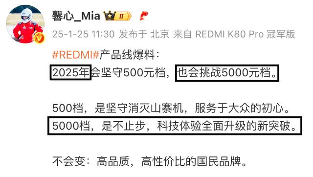 今年年初,REDMI 产品经理表示,今年会坚守 500 元旦,也会挑战 5000 元档。