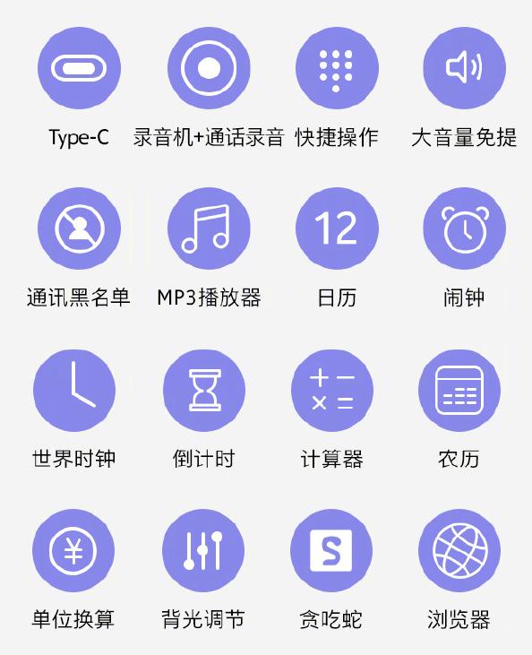 2英寸的LCD屏幕、800万像素扫码级后置单摄、Type-C充电口、3.5mm耳机孔、支持32GB内存卡扩展。