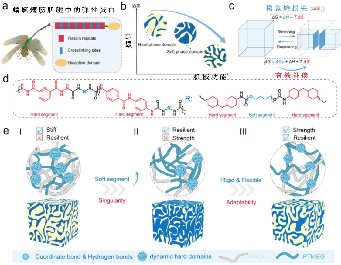 团队从分子层面动手:先在聚氨酯分子里引入动态氢键和配位键,像在分子内部埋了“魔术拉链”,它们既能牢牢固定硬域的形状,又能在拉伸时自动解锁。当材料受到外力拉伸时,硬域先分解,释放了分子链的“自由度”,熵增加(形变容易);与此同时,柔软的链段会有序结晶,吸收能量,焓降低(弹性增强);这种能量的“此消彼长”让材料变得又强又弹,一举打破了“熵罚”难题。