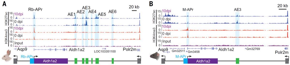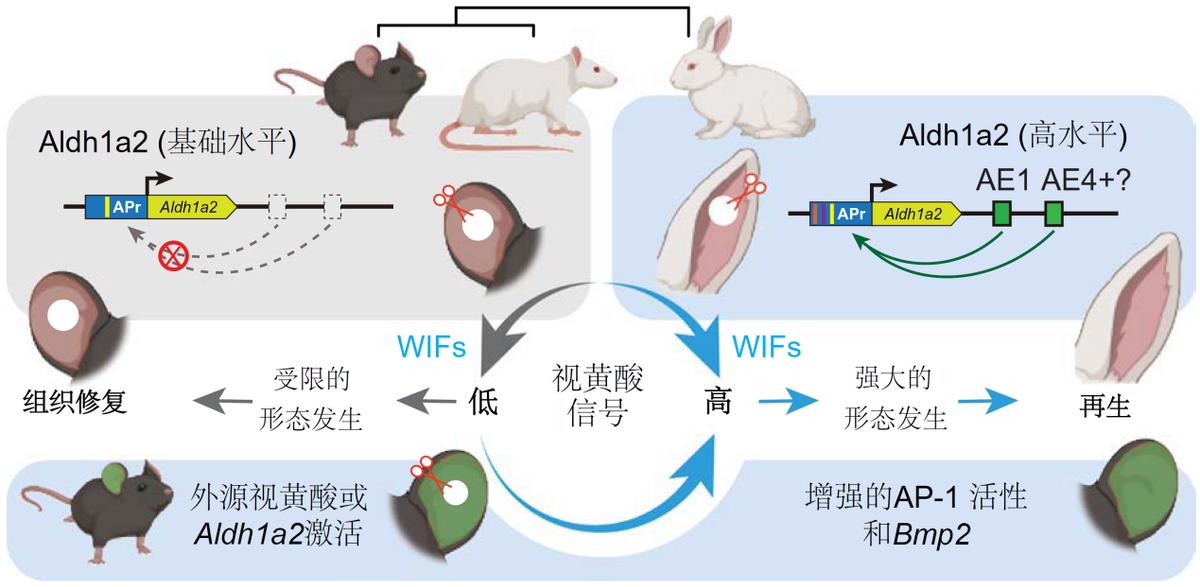 为什么小鼠的Aldh1a2基因在受伤后无法正常激活呢?研究人员在比较了兔子和小鼠基因组后发现,兔子的Aldh1a2基因周围有6个增强子元件(AE1~AE6),其中有两个增强子(AE1和AE5)在耳廓受伤再生时会被强烈激活,与基因启动子相互作用,激活基因表达。而在小鼠中,Aldh1a2基因的6个增强子元件有5个彻底失活。这可能是因为在啮齿动物祖先的演化过程中,为了适应环境压力,抛弃了这个“再生开关”。