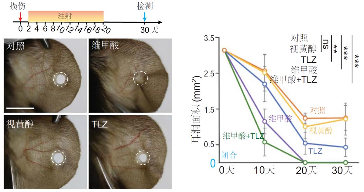 第二种是外源补充RA。结果显示,腹腔注射RA的小鼠耳廓在30天内完全再生,效果与基因治疗组相当。更有趣的是,当RA与其降解抑制剂TLZ联用时,再生速度进一步加快,证明了RA的代谢平衡对再生修复至关重要。
