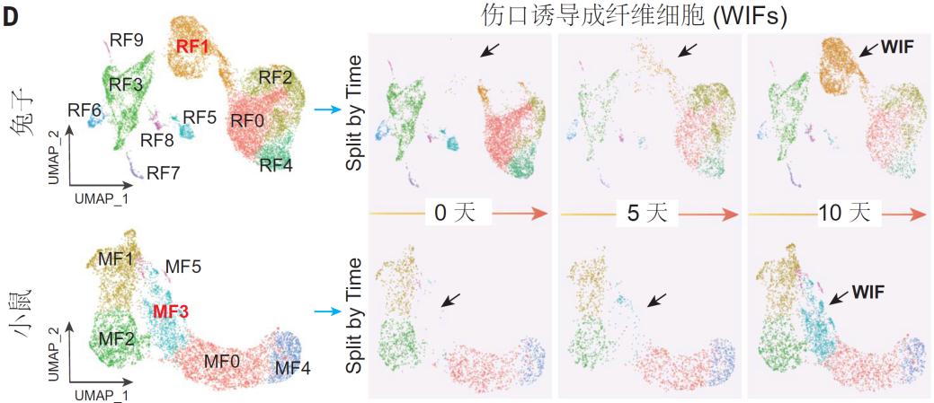 揪出关键细胞:再生指挥官WIFs为了找到程序中断的根源,科学家利用空间转录组技术分析了再生的耳廓组织,结果发现在伤口深处潜伏着一群关键细胞——伤口诱导成纤维细胞(WIFs)。它们如同再生工程的指挥官,在兔子体内高效调度修复工作:指挥干细胞分化软骨,引导血管新生,组织神经重建。