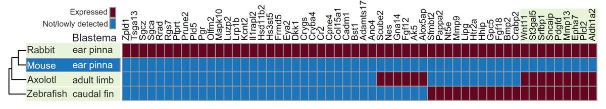 高再生潜能动物芽基中常见激活基因的鉴定,其中红色表示激活的基因,蓝色表示未激活的基因,小鼠耳廓为第二排。
