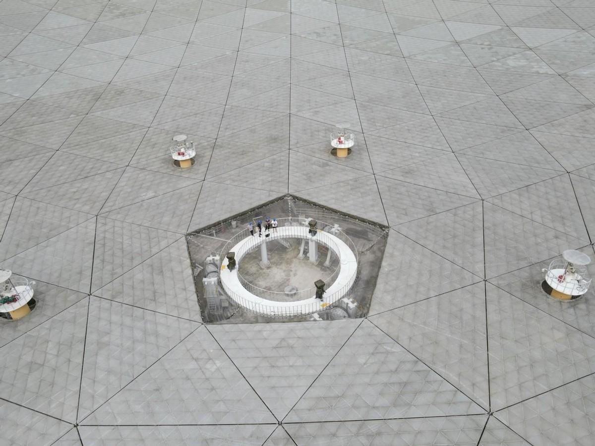 “天眼”底部为什么缺了一块?“天眼”底部的“洞”是怎么来的,为什么会存在这个五边形缺口?答案与FAST望远镜的一项重要基础设施——位于反射面底部的馈源舱停靠平台有关。馈源舱是一个直径约13米、重30吨的金属舱体,舱体内装载着超低温制冷的接收机、馈源喇叭等精密仪器。可在百米范围内实现毫米级的精准移动和姿态调整,核心作用是确保舱内接收机稳定接收反射面汇聚的宇宙无线电波信号。
