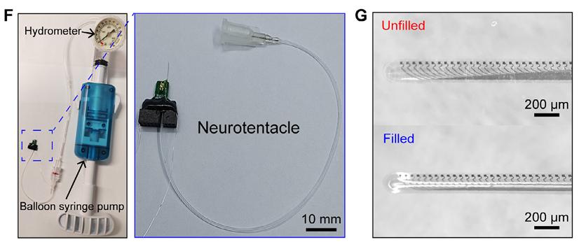 F图为已完成物理封装的神经触手探针及用于施加液压的注射泵;G图为神经触手探针在未充液与充液状态下的形态对比。