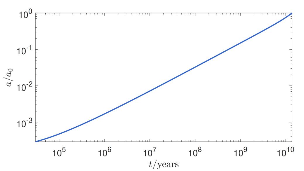 宇宙尺度作为时间的函数。这里我们设宇宙今天的尺度为1,从宇宙诞生后3万年开始绘制。