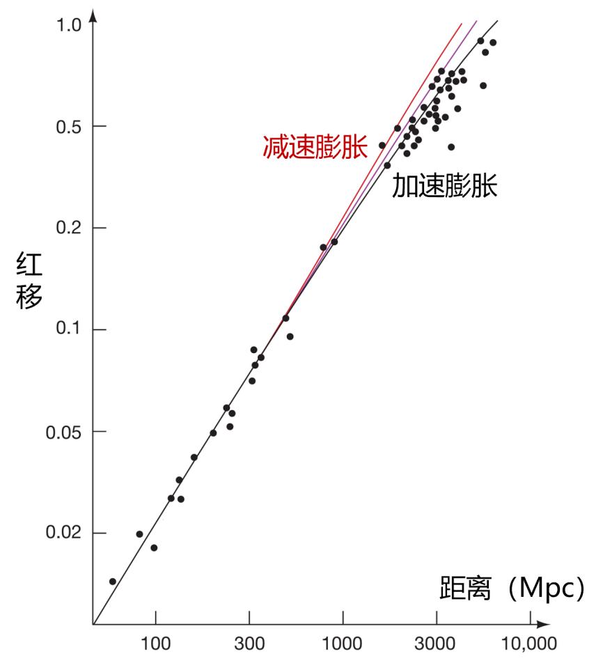 观测到Ia型超新星的红移-距离关系。大部分超新星的红移量偏低,更符合加速膨胀的宇宙所预言的红移-距离曲线(黑色曲线)。