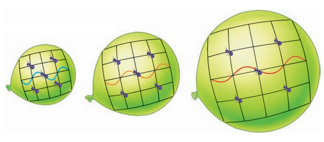 宇宙膨胀的气球类比。膨胀会造成遥远星系相互远离,并使宇宙中传播的光波红移。