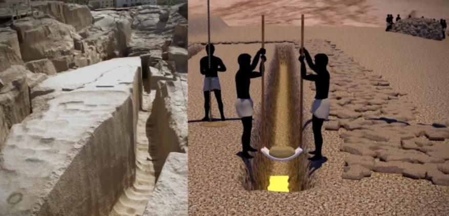 等木楔被泡的膨胀之后,石头便被胀裂,再经过简单的修缮,成为可以建造金字塔的石料。
