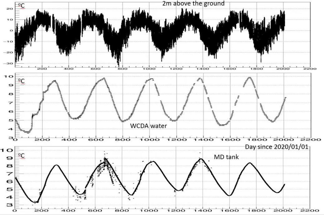 上图为观测站环境温度、水切伦科夫探测器(WCDA)和缪子探测器阵列(MD)水体温度长期监测结果。经过累积2000天的温度监测,水切伦科夫探测器(WCDA)水体年平均温度常年保持在7℃左右,缪子探测器阵列(MD)水体年平均温度常年保持在6.5℃左右,两个水介质探测器的水体最低温度常年处于零上,未产生结冰现象,探测器运行安全。
