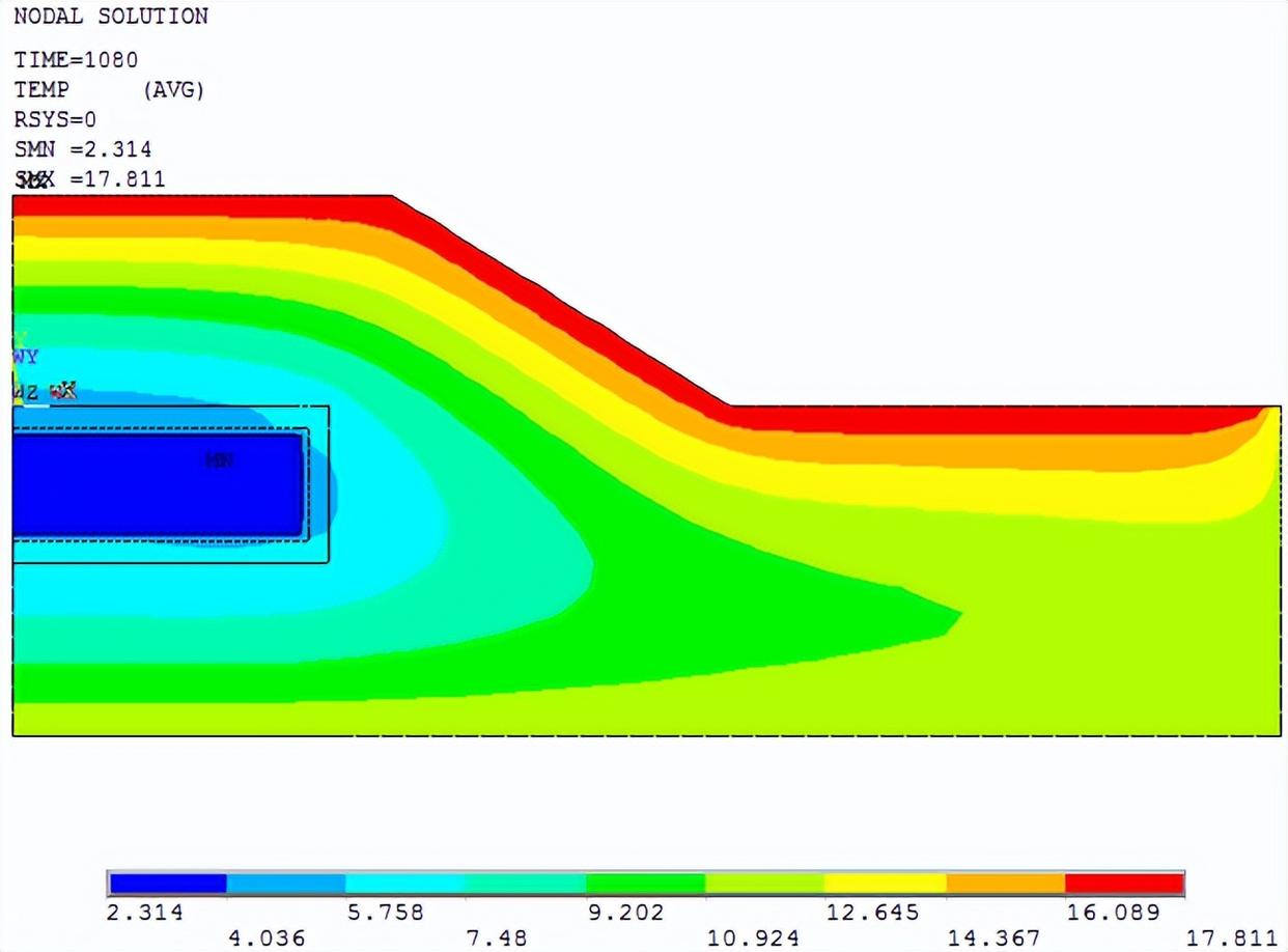 10厘米聚氨酯保温层模型下水体温度模拟,上图为水体温度最高时刻云图,下图为水体温度最低时刻云图