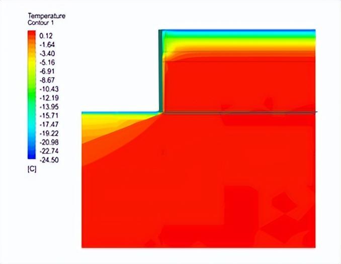 由图可见,采用120毫米厚XPS保温层时,水池的中部温度高于0摄氏度,但边缘部位靠近壁面处水温低于0摄氏度。在靠近水池壁面区域的上部,即图中所示的水池左上角部位,由于三维传热部位导致水温最低,为-0.8摄氏度。当采用150毫米厚XPS保温层时,水池整体平均温度为0.98摄氏度,即使是靠近水池左上角的最低水温部位也有0.08摄氏度,故切面所示各部位均不会结冻。