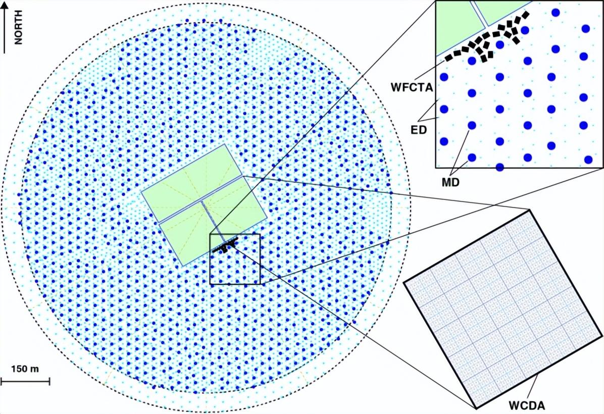 78000平方米的水切伦科夫探测器阵列(WCDA),测量簇射次级粒子在水中产生的切伦科夫光,在甚高能段,实现对银河系内北天区的伽马射线源的巡天普查,并监测视场中的时变现象;18台广角切伦科夫望远镜阵列(WFCTA),测量簇射次级粒子在大气中产生的切伦科夫光或荧光,实现对宇宙线分成份能谱的精确测量,破解“膝”的成因。