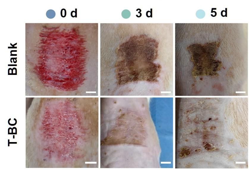 其次,在模拟深Ⅱ度烧伤削痂创面的大鼠模型中,T-BC敷料展现出显著的促愈合效果。治疗组在第5天的创面闭合率明显高于未处理组,表明该材料可有效加速创面愈合进程。