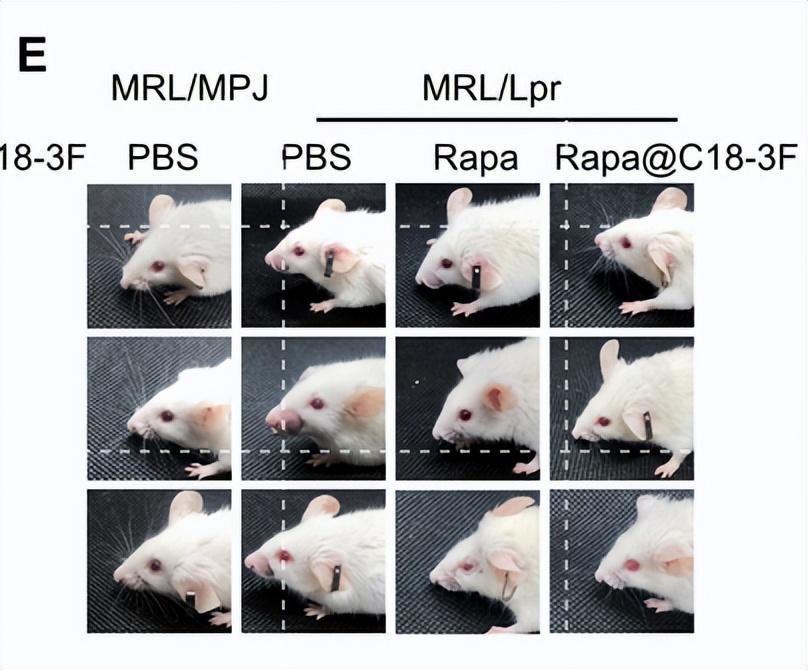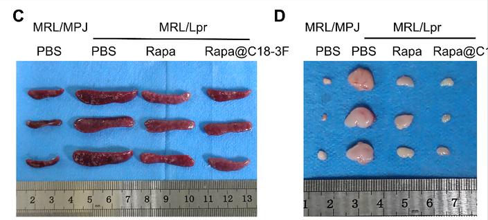 接下来,研究人员在系统性红斑狼疮小鼠模型中测试了负载雷帕霉素的C18-3F纳米颗粒(Rapa@C18-3F)的治疗效果。这些模型小鼠会自发出现类似人类系统性红斑狼疮的症状,如皮肤病变、肾脏损伤、免疫系统过度激活等。实验展现出明显的效果: