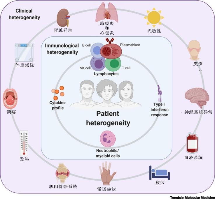 系统性红斑狼疮是累及全身多个脏器的自身免疫性疾病,其发病与免疫系统的异常密切相关。临床表现多种多样,包括肾炎、胸膜炎、心脏损伤、神经系统疾病、关节炎、光敏性、脱发、皮肤红斑、雷诺症状、血液系统异常、发热疲劳等。