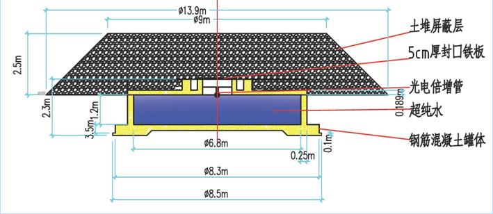 由1188个埋在土堆下的水罐组成,它们被设计用来接收“粒子雨”中穿透力极强的缪子。在这些水罐中封装着的是超纯水,这是因为它们需要在长达20年的时间内保持水质稳定。这些水罐还被埋在土堆下,这是为了阻挡除了缪子以外的其他穿透能力较弱的粒子。