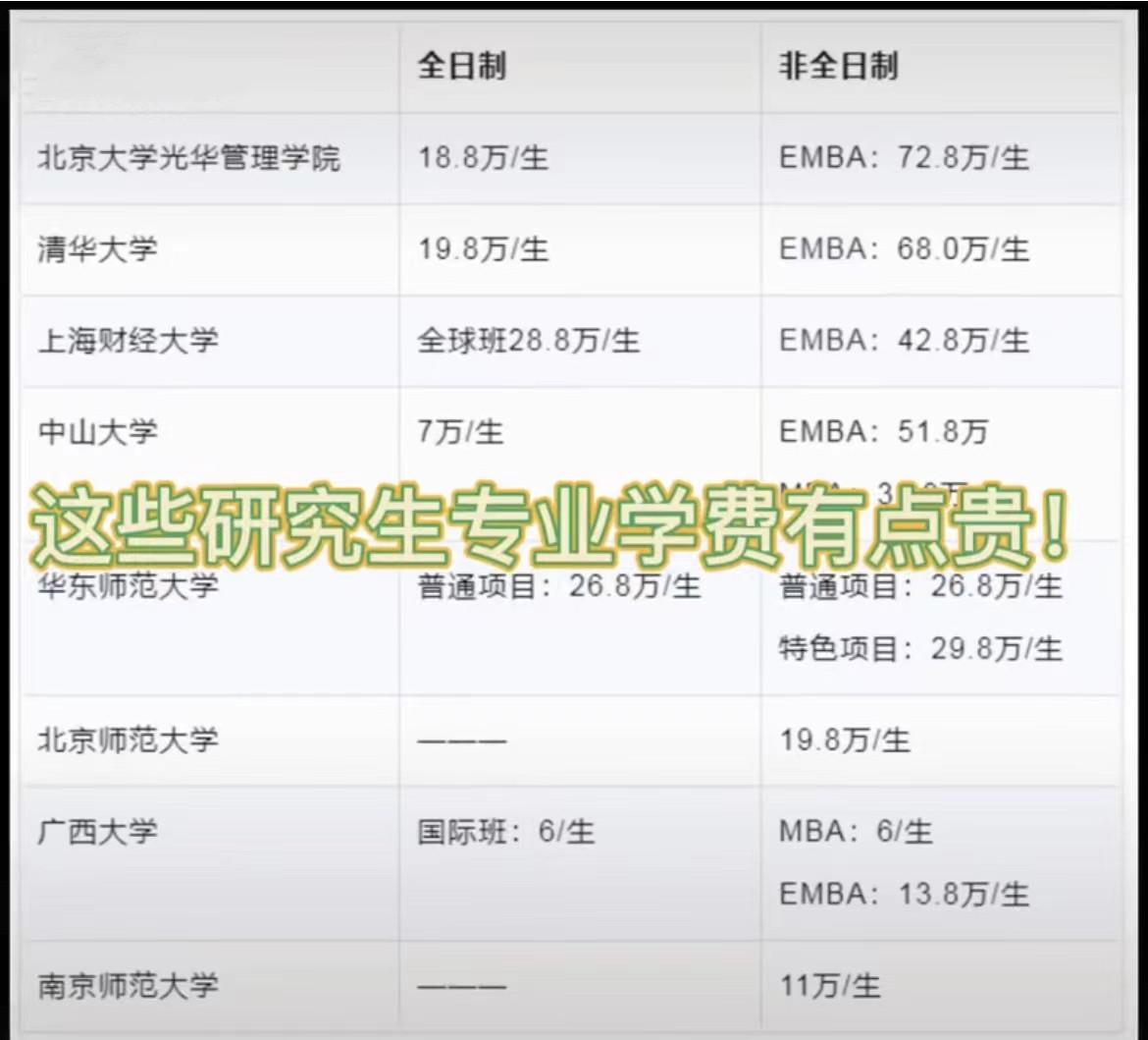 我们可以看到,全日制研究生的学费是远远低于非全日制的,不过有些专业的学费也让普通家庭望而却步。