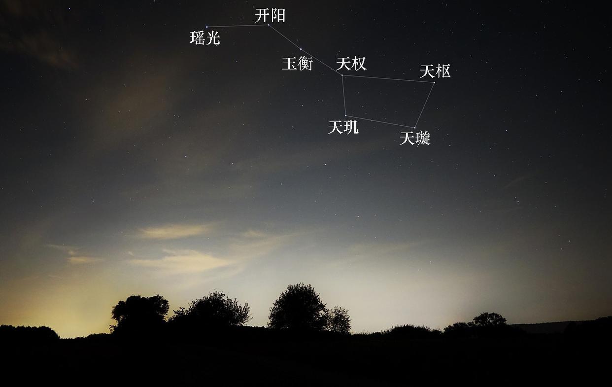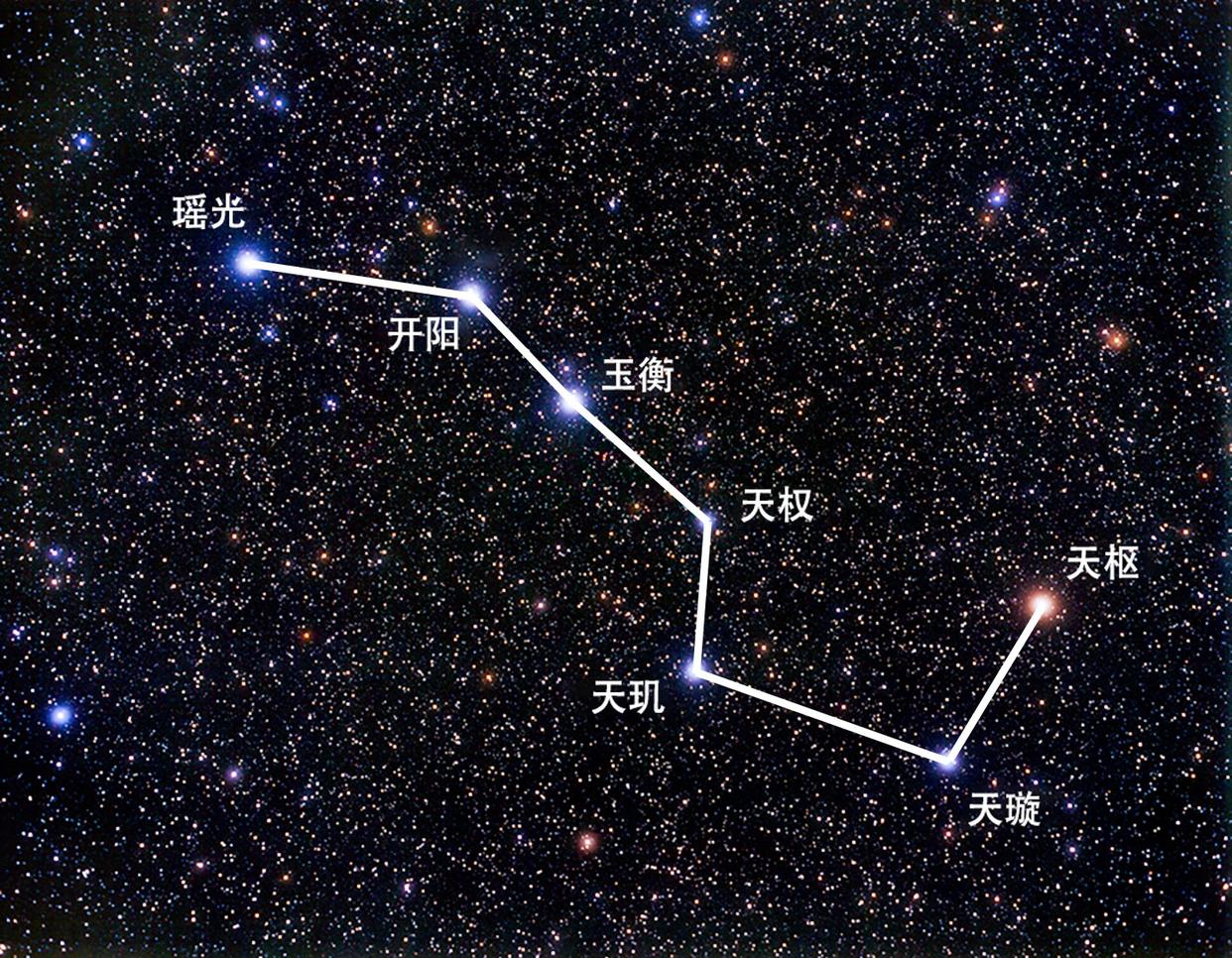 我国对北斗七星的记载可以追溯到两千年前的汉代,古人给每颗星都起了十分有意境的名字。其中斗第一至第四颗星分别为天枢、天璇、天玑、天权,它们又统称为斗魁;第五至第七颗星位玉衡、开阳、瑶光,它们又统称为斗杓。