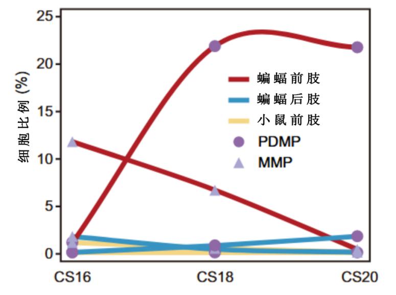 P大师像是青训队,在蝙蝠发育的后期阶段分化为其他细胞状态。而M大师则在蝙蝠前肢的发育过程中起到关键作用。研究发现M大师的比例在CS16时约为1.1%,到CS20时增加到约21.8%,而在发育中的蝙蝠后肢中保持较低水平。