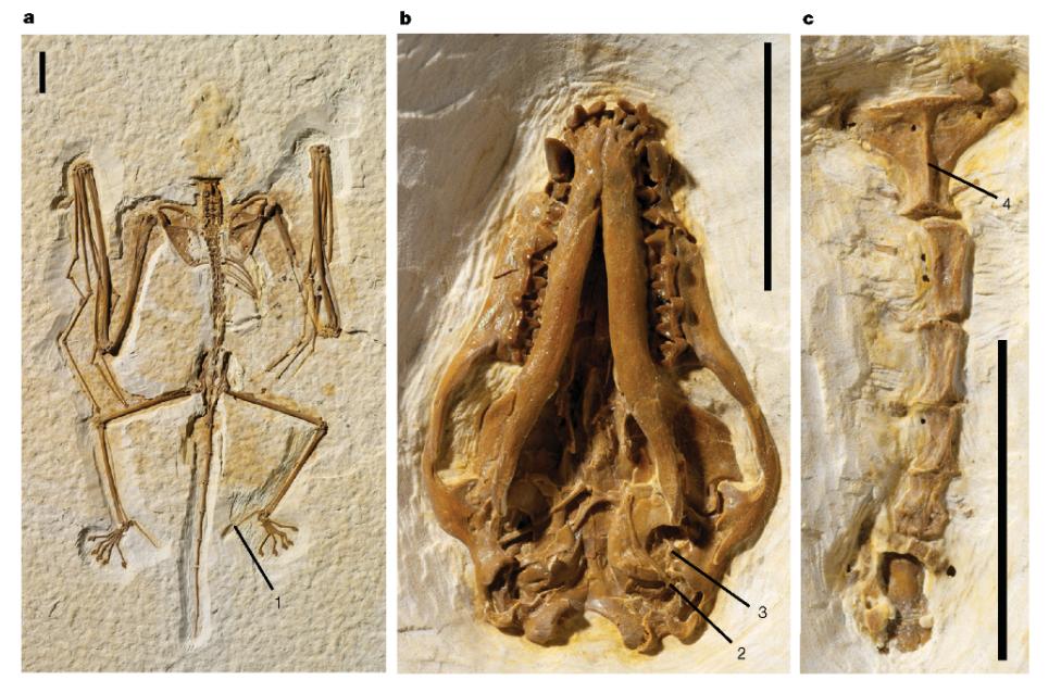 芬氏爪蝠(Onychonycteris finneyi)的正模标本(ROM 55351A)。a.背面观骨骼;b.腹面观头骨;c.腹面观胸骨。