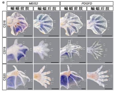在CS16、CS18和CS20阶段的蝙蝠前肢和后肢中,对MEIS2和PDGFD进行原位杂交,前肢指间膜中显著表达,而后肢中未检测到表达。