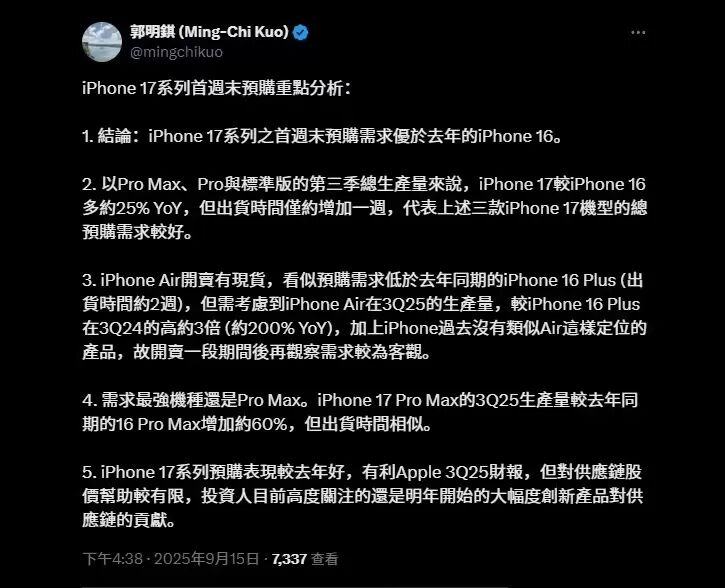 今天,知名分析师郭明錤也发文称,iPhone 17 系列全球首周末预售表现优于去年 iPhone 16,需求最强的机型仍是 Pro Max。